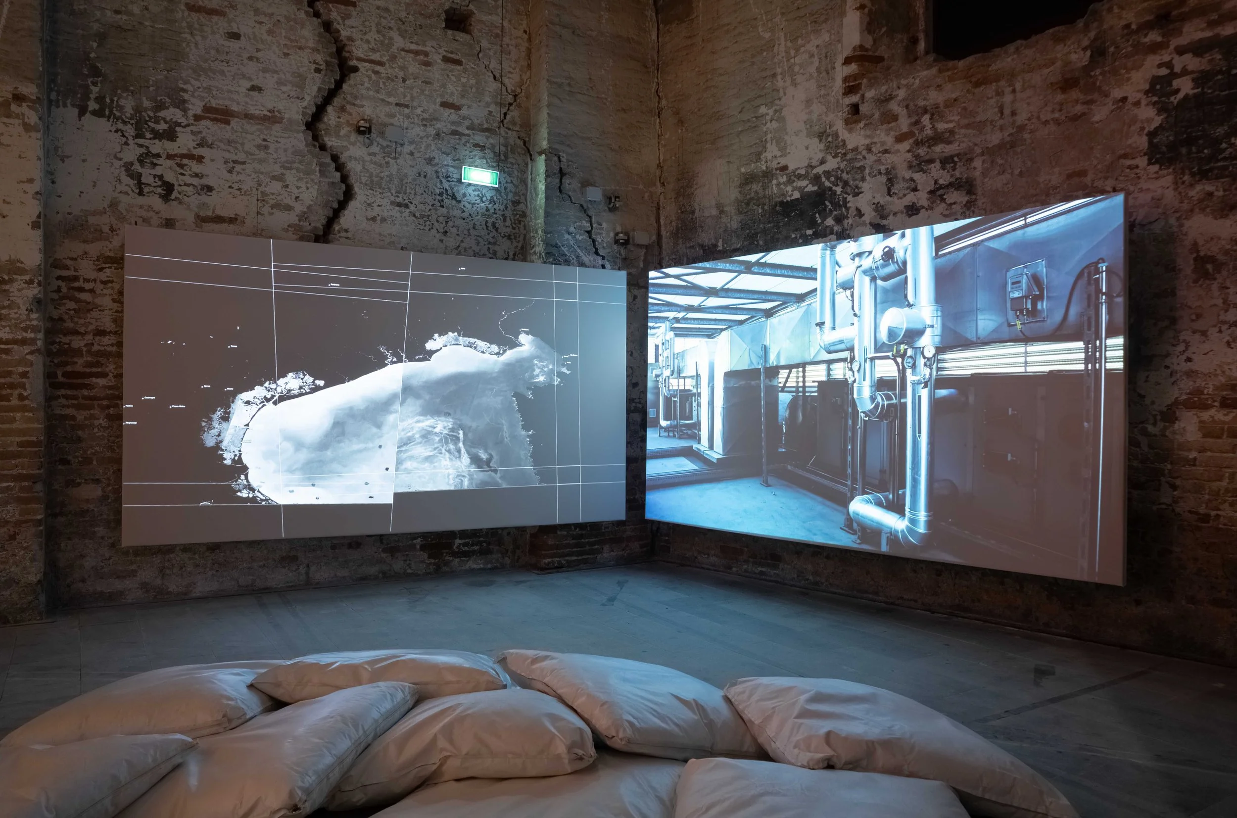Images: stills from the audiovisual piece and photos from the project’s installation in the Arsenale at La Biennale di Venezia 2025.