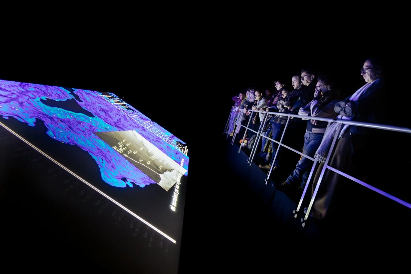 Featuring different works by the LIMINAL, Forensic Oceanography and Border Forensics collectives, the multimedia installation From Sea to Sky approaches intersectional immobility and frontier-based violence at sea. The objective of the exhibition was to highlight the way in which the Mediterranean maritime space has been transformed into a militarized border zone. From Sea to Sky was a multimedia installation specially created for the Festival d'Automne and CENTQUATRE-PARIS.